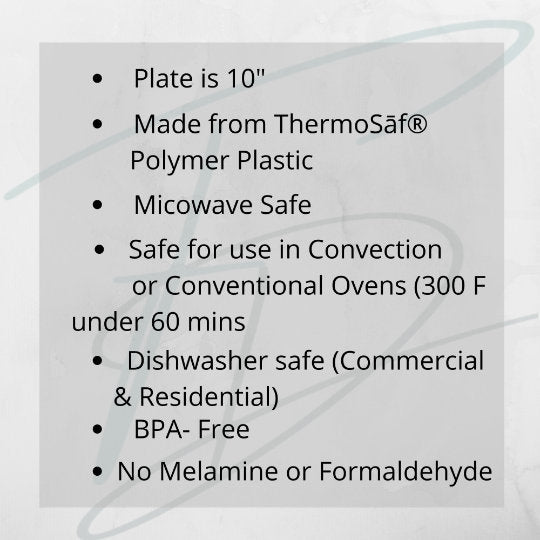 10" dinner plate manufactured from revolutionary ThermoSāf® Polymer that is: